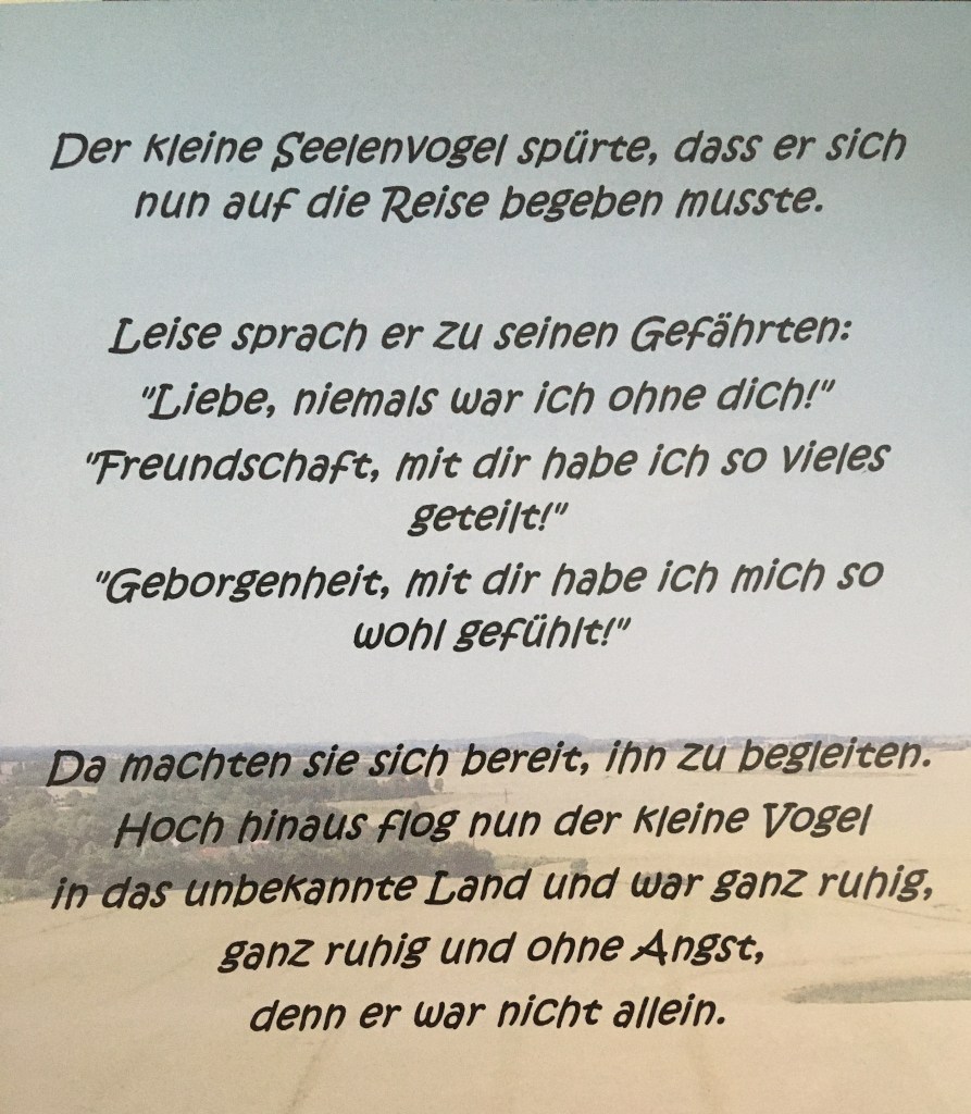 Nie vergessen werde ich Deinen letzten Abend. Der zuständige Arzt kam noch einmal nach Dienstschluss bei uns vorbei, um nach Dir zu schauen. Deine Oma war auch gerade anwesend. Kurz zuvor wurdest Du einmal wach und hattest etwas gesehen, das für uns nicht sichtbar war. Ein Vogel. Da spürte ich bereits, dass Du nicht mehr langen leben würdest. Auch der Arzt sagte später: Nun ja, es ist nun schon sehr endlich, als Deine Oma fragte, wie lang er noch leben würde. Genau sagen konnte das niemand – und das war ja auch gut so.