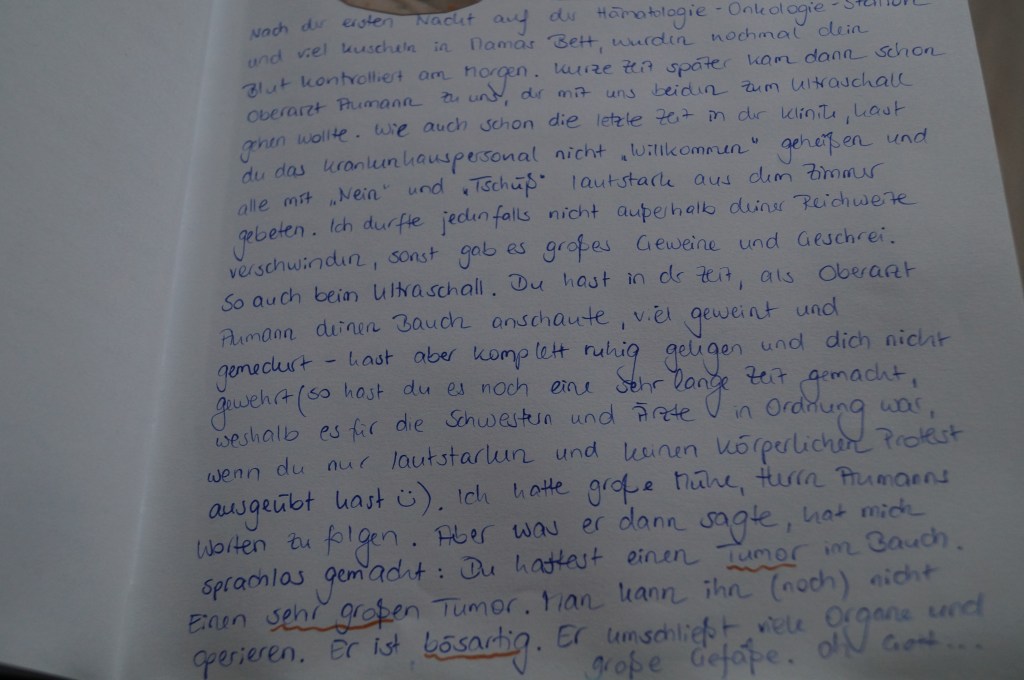 Ich schaue in das Kliniktagebuch, das ich für mein Kind damals begann zu schreiben. Ich wollte alles für ihn festhalten, damit er später einmal auf etwas blicken könnte, was für ihn nicht mehr ganz so präsent gewesen wäre. Er hätte Narben am Körper, Hörgeräte getragen und regelmäßige Kontrollen in der Onkologie mitgemacht – aber vielleicht nicht mehr genau gewusst, warum eigentlich.