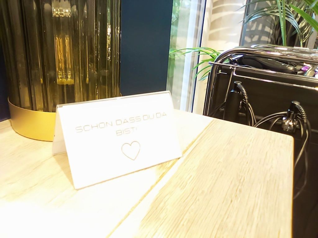 Wir gehen zum Waschbecken, um die Farbe auszuspülen. Und: Ich bekomme, wie jedes Mal, eine wunderbare Kopfmassage. Der Waschraum ist abgetrennt vom Salon. Es läuft ruhige Entspannungsmusik, es ist angenehm beleuchtet – dieser Raum wurde bewusst so gestaltet und unterstreicht jedes Mal das Wellness-Gefühl, wenn ich dort bin.