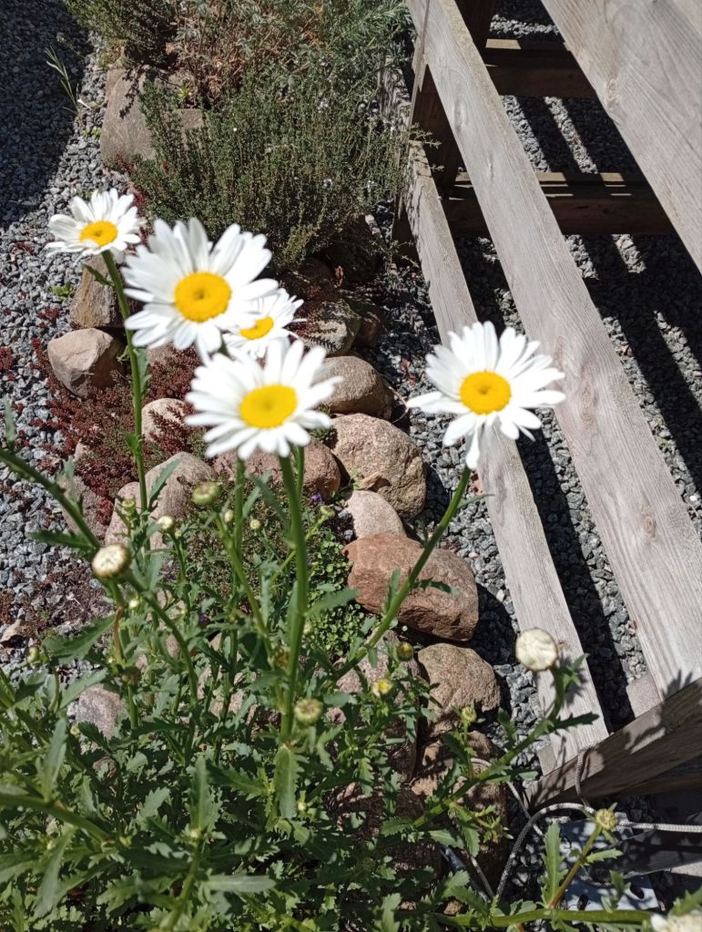 Im vergangenen Jahr habe ich mich an den Steinwall gewagt, der Stellplatz und Terrasse optisch voneinander abgrenzt. Bislang war es einfach nur ein kleiner Wall aus Findlingen und irgendwann sah ich in der Umgebung in einem Vorgarten eine bepflanzte Natursteinmauer. Also füllte ich Erde auf und setzte fröhlich und frei alles mögliche hinein, dass sich zwischen Steinen wohlfühlen könnte. Und siehe da: In den vergangenen Wochen erblüht wieder alles, das den Winter überlebt hat. Diese triste Ansammlung von Steinen lädt nun wieder Bienen und andere Insekten zum Verweilen ein, denn zwischen den Findlingen erstrecken sich Thymian, Braunelle, Lavendel und Wiesen-Margerite. Die Sukkulenten füllen die schmalen Zwischenräume und werden im Sommer auch wieder Blütenstände entwickeln. Ich kann’s kaum erwarten.